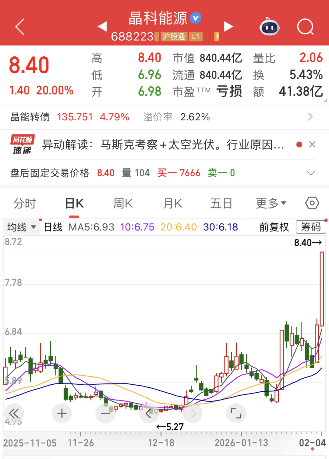 2月4日晚间,晶科能源发布股票交易异常波动公告 ,公司关注到近期资本市场对“太空光伏”等概念关注度较高,相关板块二级市场表现较为活跃 。目前“太空光伏”尚处技术初步探索阶段,产业化进程受技术发展、行业政策 、市场环境等多方面因素影响 ,未来技术应用与产业化落地仍需要一定的时间周期。截至目前,公司主营业务产品仍聚焦于地面光伏领域,公司未有涉及“太空光伏 ”的订单收入 ,未对公司经营业绩造成影响,请投资者注意理性判断。